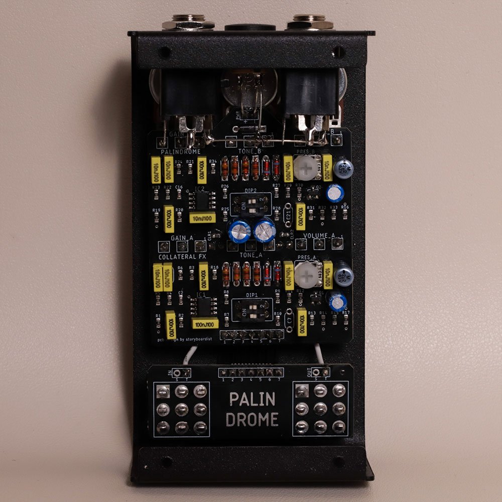 O Palindrome Overdrive / Boost foi um dos primeiros hits da Collateral FX, trazendo uma releitura autoral e modernizada do pedal Marshall Blues Breaker. A sonoridade excessivamente brilhante do pedal original aqui pode ser somada com seu controle de Presence, e sua estrutura de ganho foi expandida. É possível desativar a clipagem por diodos, oferecendo um poderoso Clean boost em ambos canais, ativar o soft clipping – para ter a sonoridade clássica do original – e ligar o hard clipping para timbres mais comprimidos, ou mesmo somar as duas opções de diodos para níveis ainda maiores de ganho.
