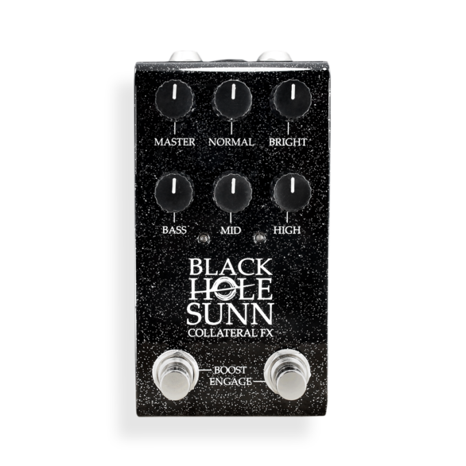 The Black Hole Sunn is based on the legendary and massive Sunn Model T amplifiers, which were designed for use with both guitars and basses. Like many amplifiers of the time, they featured two inputs: normal and high treble, each with its individual gain. Similar to the practice with Marshall Plexi amps, it is common to “jump” these two channels and use them in parallel to offer a more balanced and less shrill sound – and here, this option is represented by the Normal and Bright knobs, which refer to the gain of each of these stages.